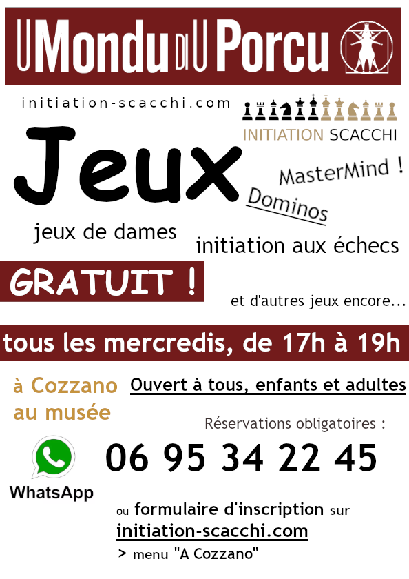 Tous les mercredis de 17h à 19h, au musée U Mondu di u Porcu à Cozzano, nous organisons des ateliers autour des échecs (initiation, divers mini-jeux échiquéens, parties entières..).